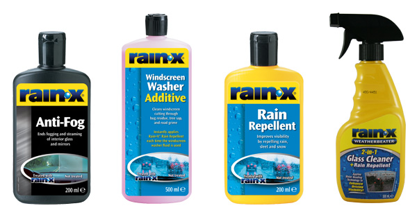There are many glass cleaners and sealants available; probably the most instantly recognised brand is Rain-X, a sealant which infills microscopic holes in glass and forms a clear hydrophobic film over the surface.